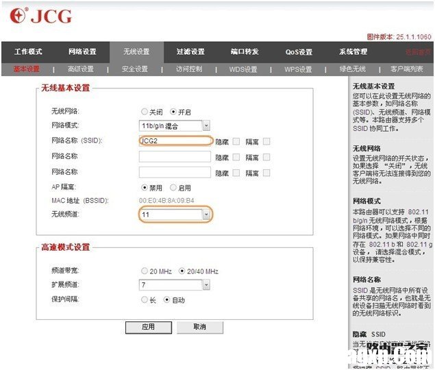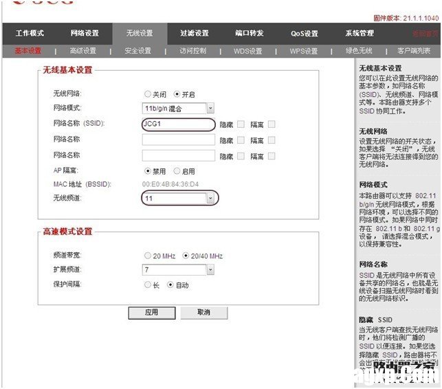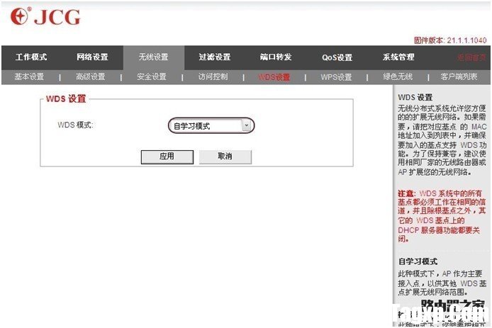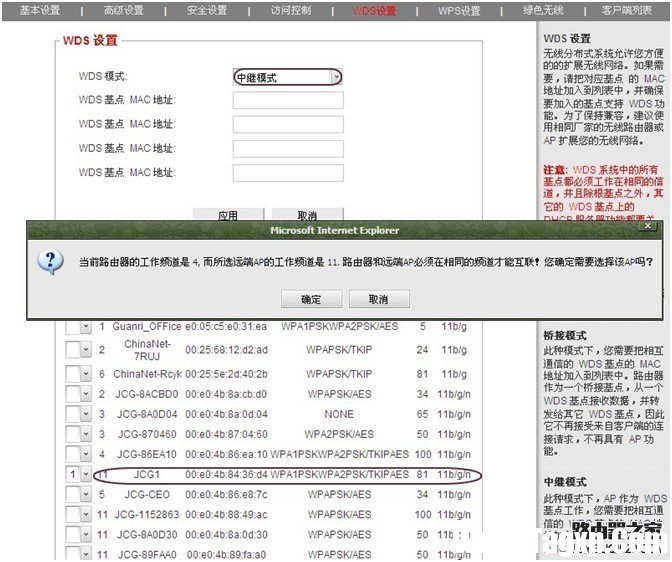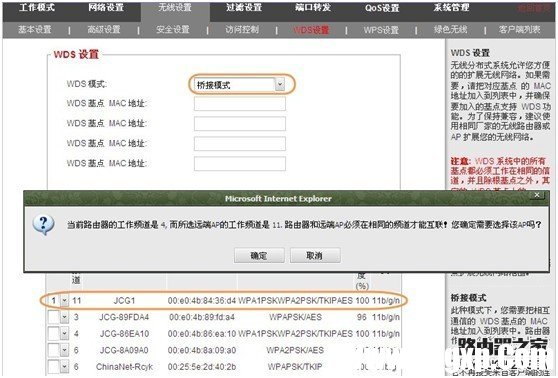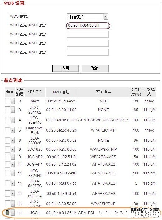 1. 进入路由器的管理界面——高级设置——无线设置——WDS设置——WDS模式(桥接模式) 点扫描,搜索到前面主路由器的SSID,选择1,如果提示更改频道,点确定。查看对应主路由器的MAC是否已经填入到WDS基点MAC地址里面,点应用保存设置。
