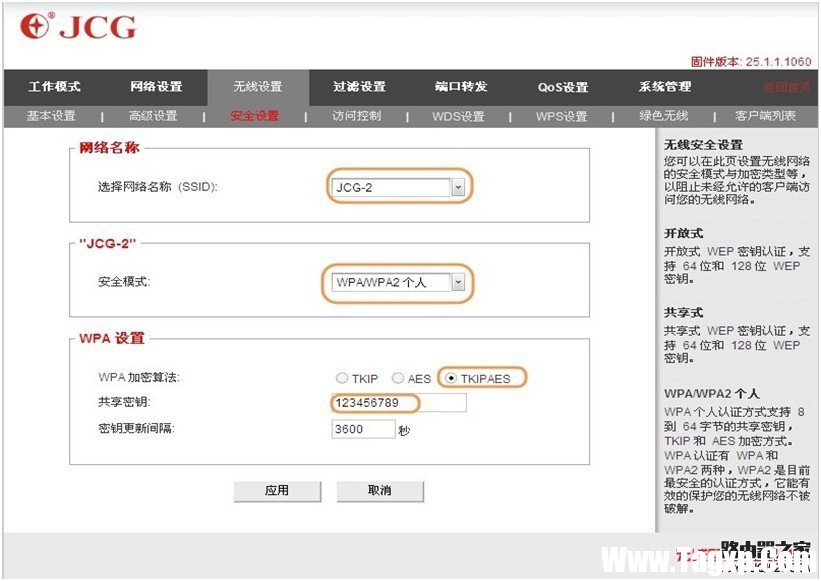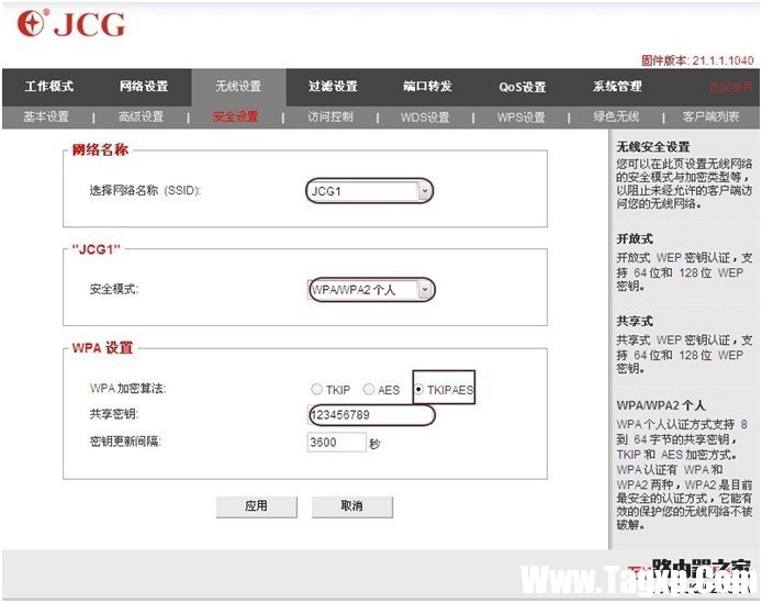 3.安全设置(安全模式,加密算法,密码选择和主路由器一样)