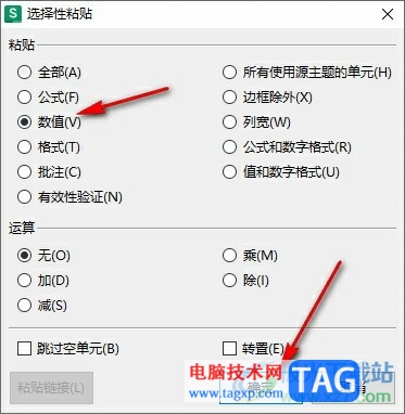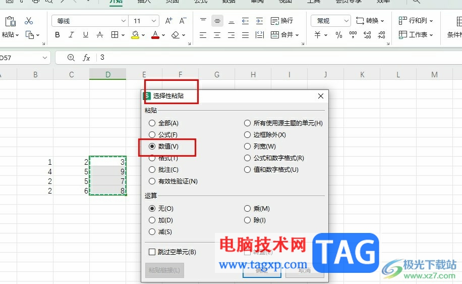 4、第四步,进入选择性粘贴页面之后,我们在该页面中点击“数值”选项,再点击确定选项即可