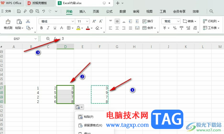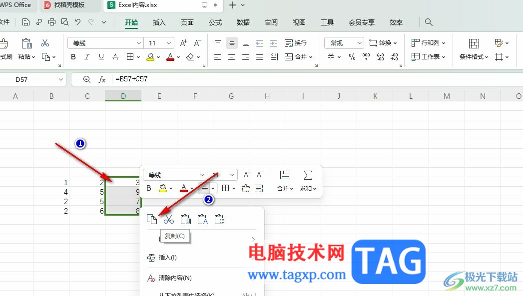 2、第二步,进入WPS页面之后,我们选中需要去除公式的单元格,然后右键单击选择“复制”选项