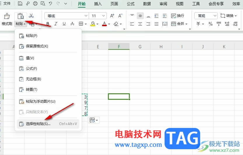 3、第三步,接着我们点击任意一个空白单元格,然后在开始的子工具栏中打开粘贴工具,再在下拉列表中选择选择性粘贴选项