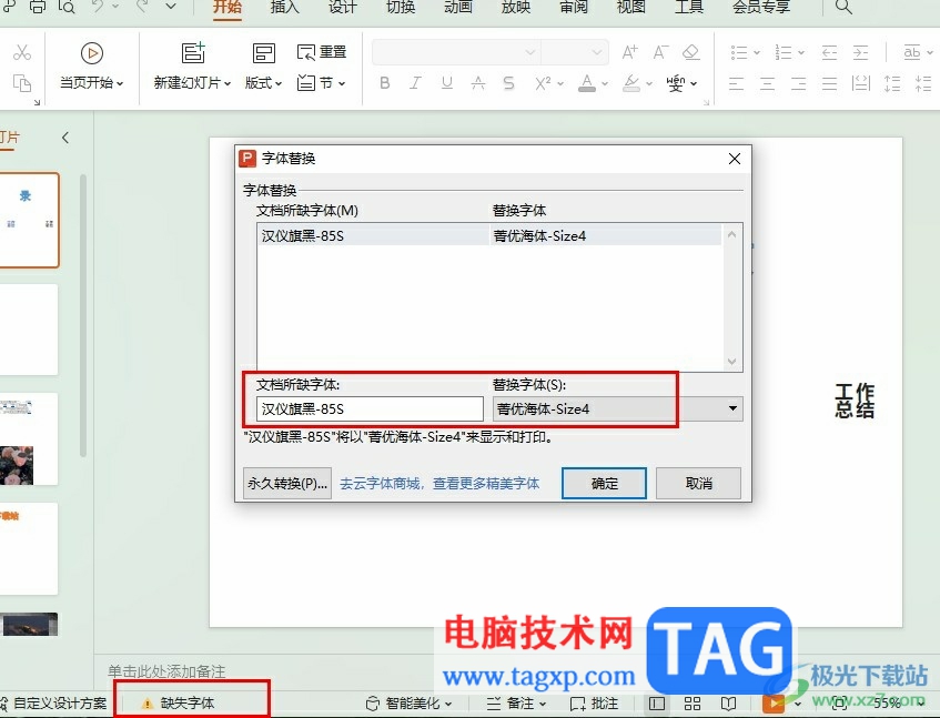 很多小伙伴之所以喜欢使用wps来对演示文稿进行编辑,就是因为WPS中的功能十分的丰富,并且操作简单,即使是刚开始使用WPS的小伙伴也能快速上手。有的小伙伴在使用WPS对演示文稿进行编辑的过程中可能会遇到WPS中缺少某种字体的情况,这时我们只需要打开缺失字体选项,然后在选项列表中点击选择“替换为其它字体”选项,最后在弹框中选择好自己需要的替换字体,再点击确定选项即可。有的小伙伴可能不清楚具体的操作方法,接下来小编就来和大家分享一下WPS PPT将缺失字体替换为其它字体的方法。