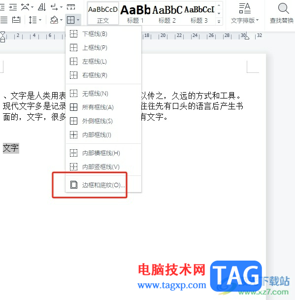 3.接着将会弹出下拉选项卡,用户选择其中的边框和底纹选项