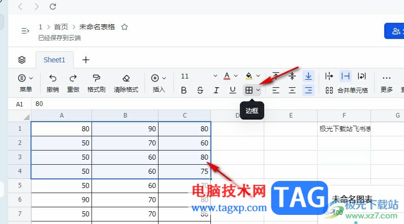 3、第三步,进入表格文档编辑页面之后,我们在表格中选择需要更改边框颜色的单元格,然后在工具栏中打开边框工具