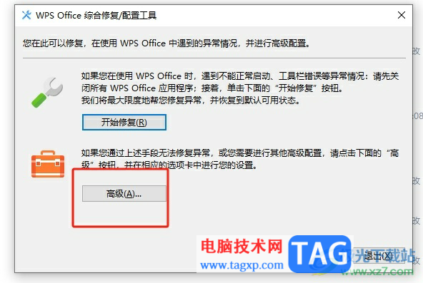 3.在打开的wps office综合修复/配置工具窗口中,用户直接按下高级按钮