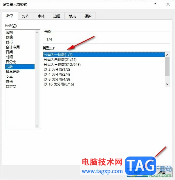 4、第四步,进入分数设置页面之后,我们在类型框内选择一个分数的分母类型,然后点击确定选项