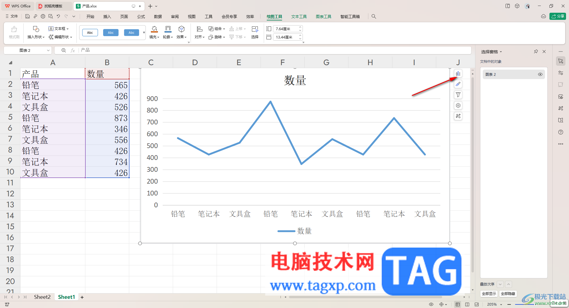 4.你可以看到插入之后的折线图是没有数据标签显示的,那么我们需要将该图标右上角的第一个图标点击打开。