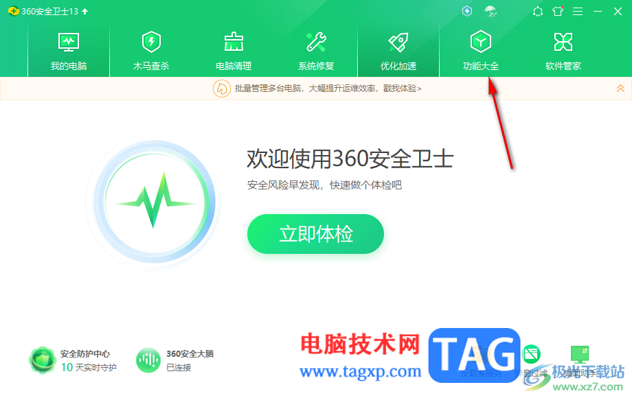 1.将电脑上的360安全卫士双击打开,在打开的窗口页面上将【功能大全】选项进行点击。