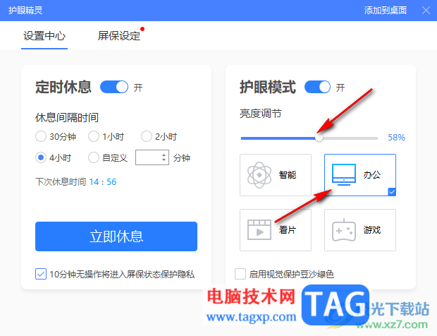 4.之后,我们在下方选择类型进行设置护眼模式的亮度,比如选择【办公】,那么亮度就会自动的调节。