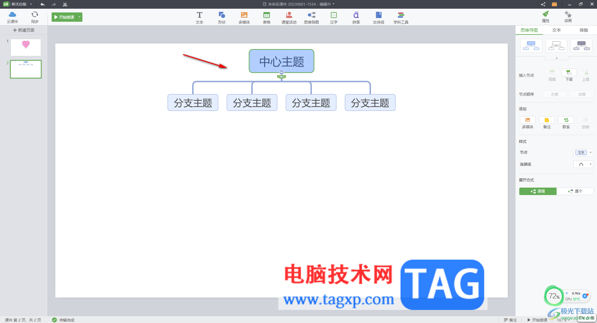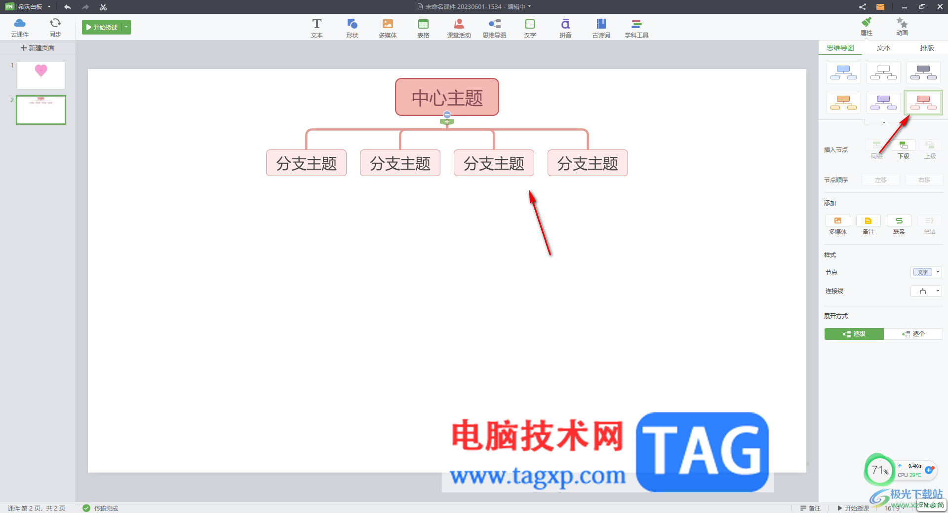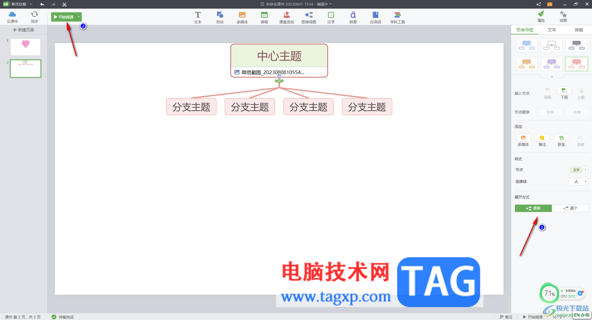 6.你可以选择排在播放的时候,思维导图展示的方式,之后点击左上角的开始授课按钮进行播放演示即可。