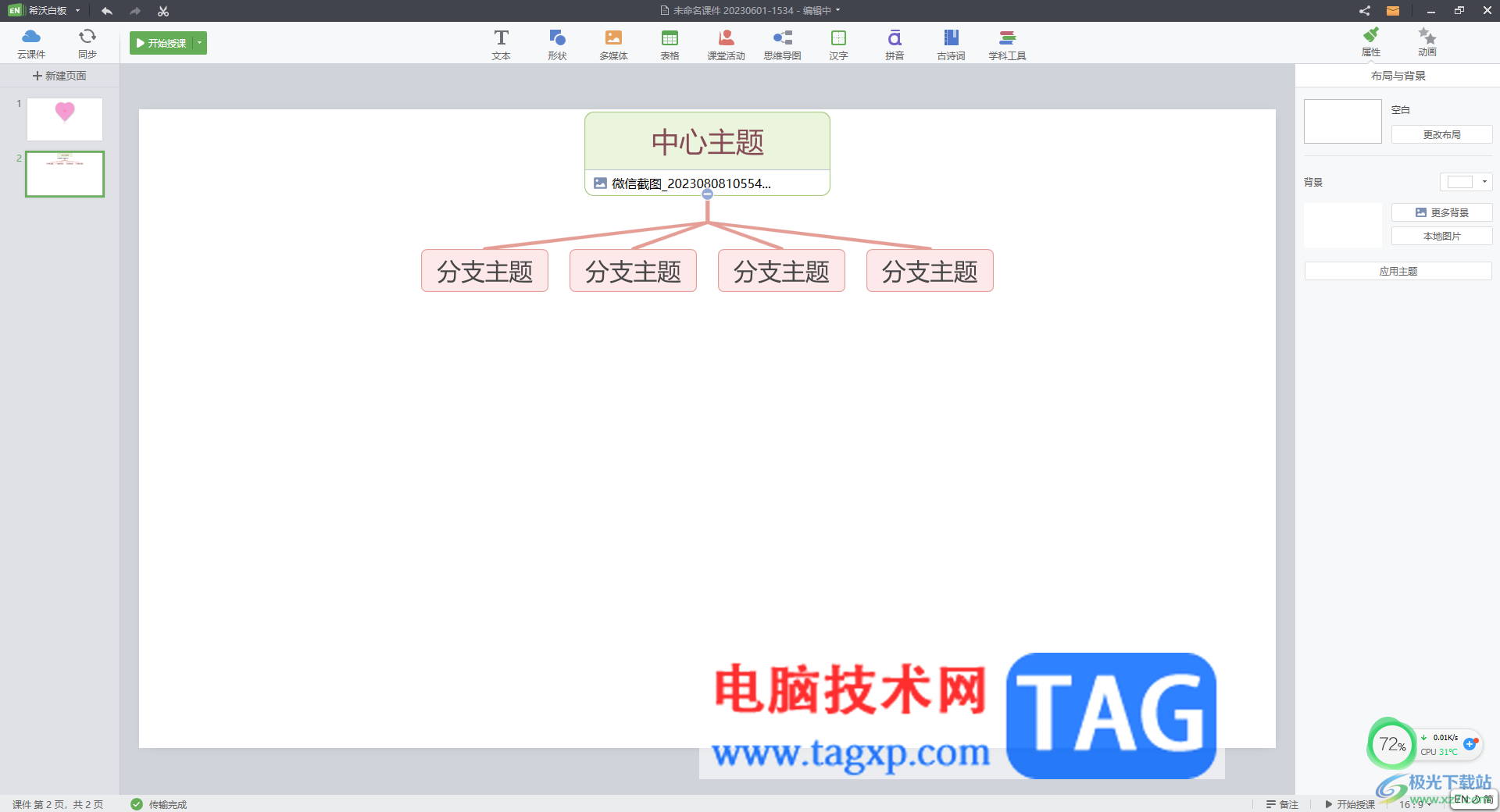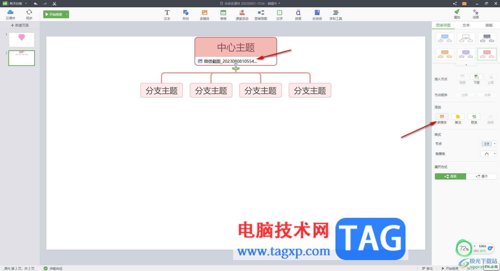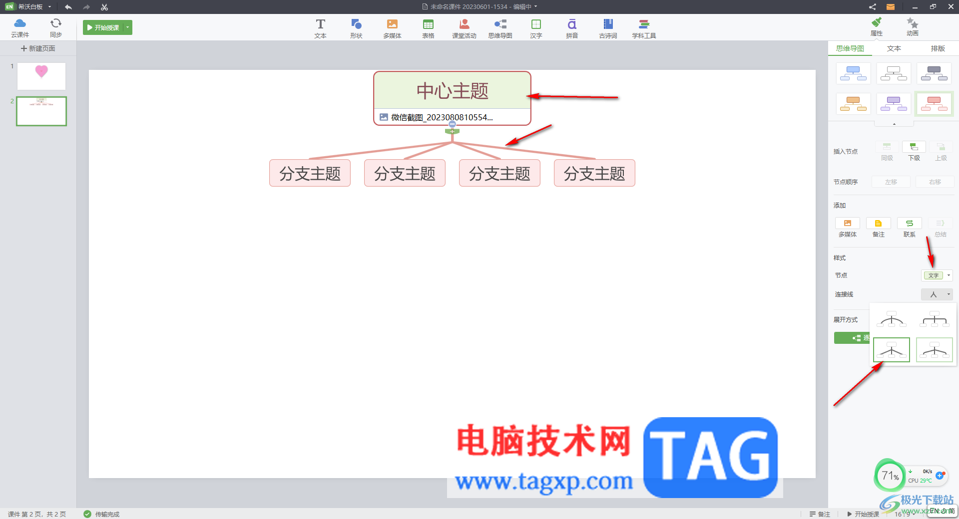 6.你可以选择排在播放的时候,思维导图展示的方式,之后点击左上角的开始授课按钮进行播放演示即可。