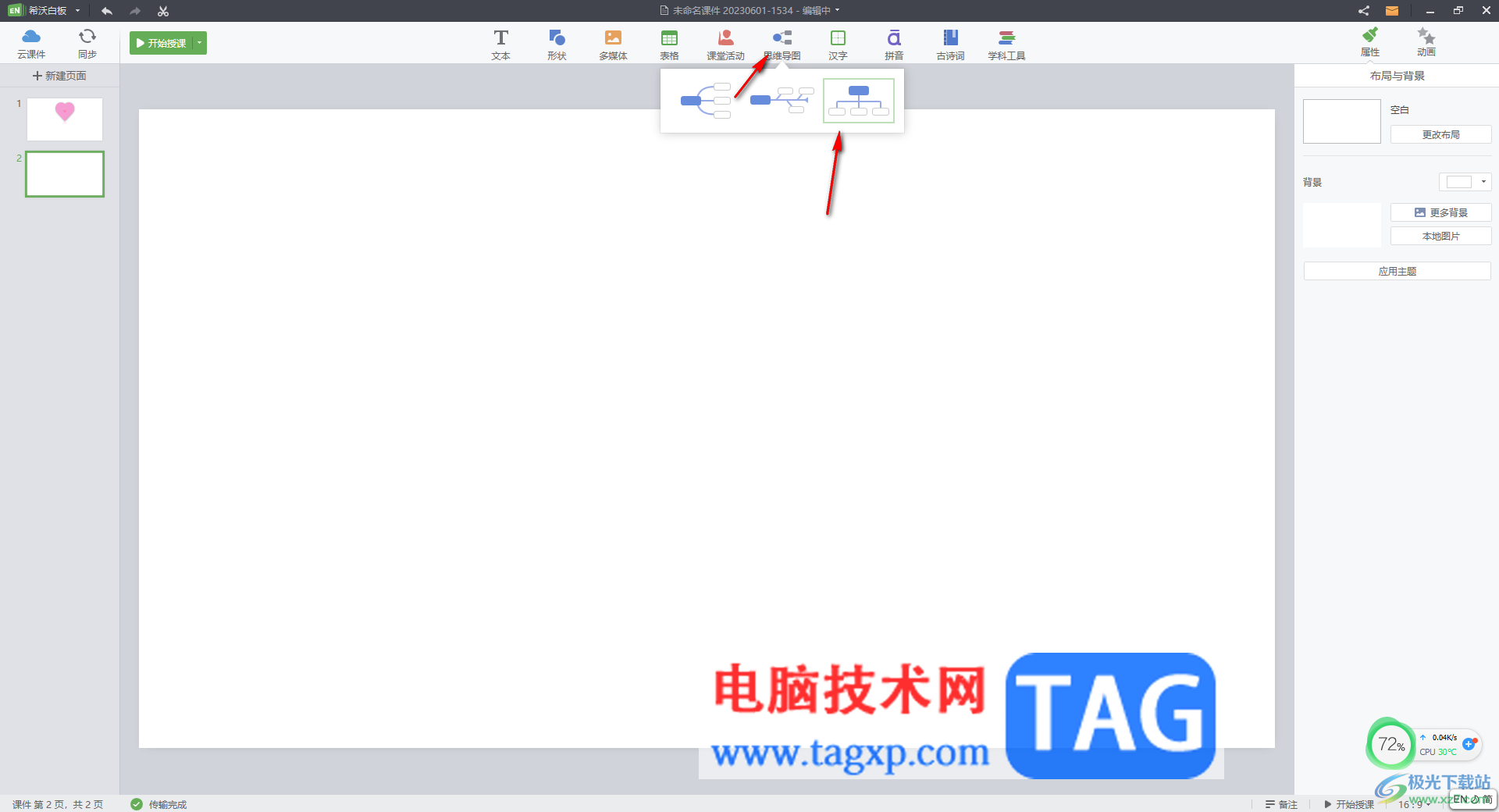 1.首先,我们需要将希沃白板5点击打开进入到制作课件的窗口,在页面顶部的位置将【思维导图】点击一下,选择自己喜欢的一个导图样式插入。