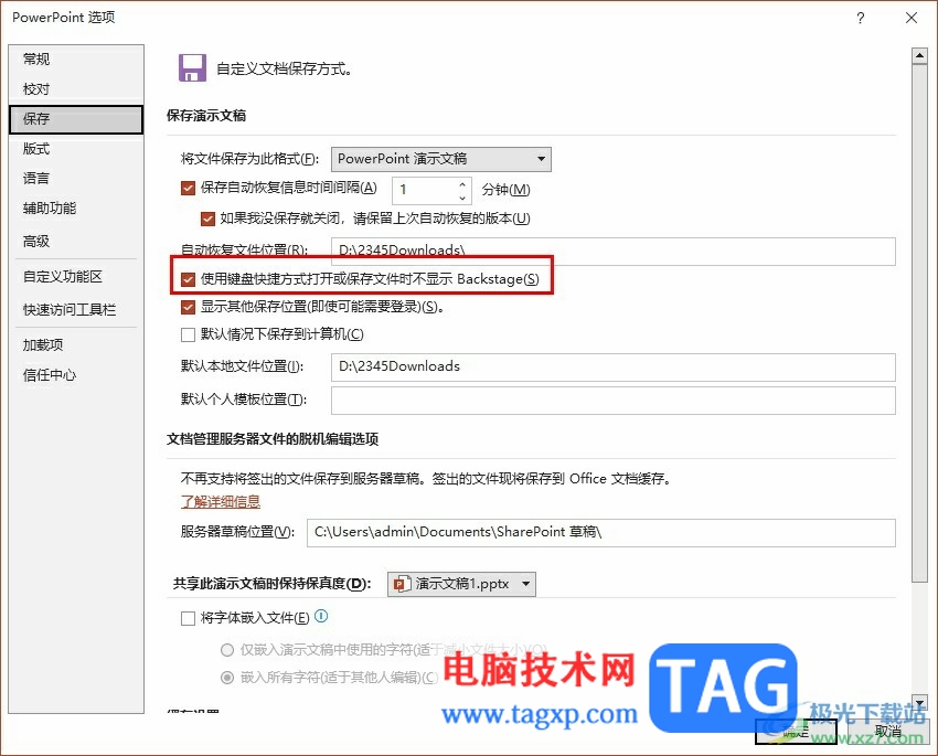 5、第五步,在保存设置页面中,我们勾选“使用键盘快捷方式打开或保存文件时不显示Backstage”选项,再点击确定选项即可
