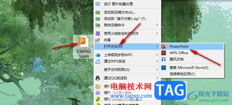 1、第一步,我们在电脑中右键单击一个需要编辑的演示文稿,然后在菜单列表中点击打开方式选项,接着在子菜单列表中选择“powerpoint”选项