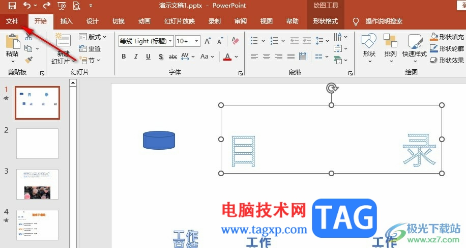 2、第二步,进入PPT页面之后,我们在页面左上角点击打开“文件”选项