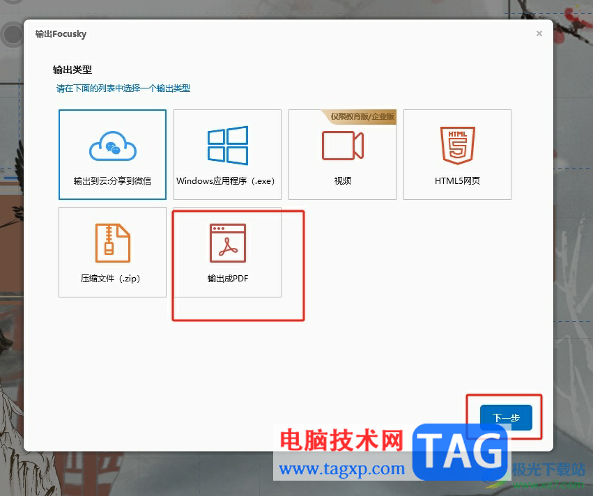 4.这时用户在输出focusky窗口中,点击输出成pdf格式并按下下一步按钮
