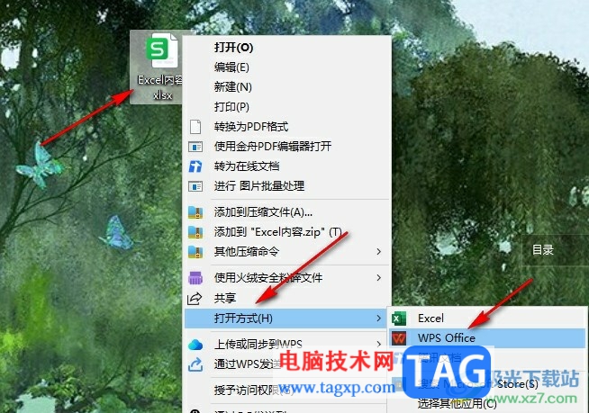 1、第一步,我们先右键单击一个表格文档,然后在菜单列表中点击打开方式选项,再在子菜单列表中选择WPS office选项