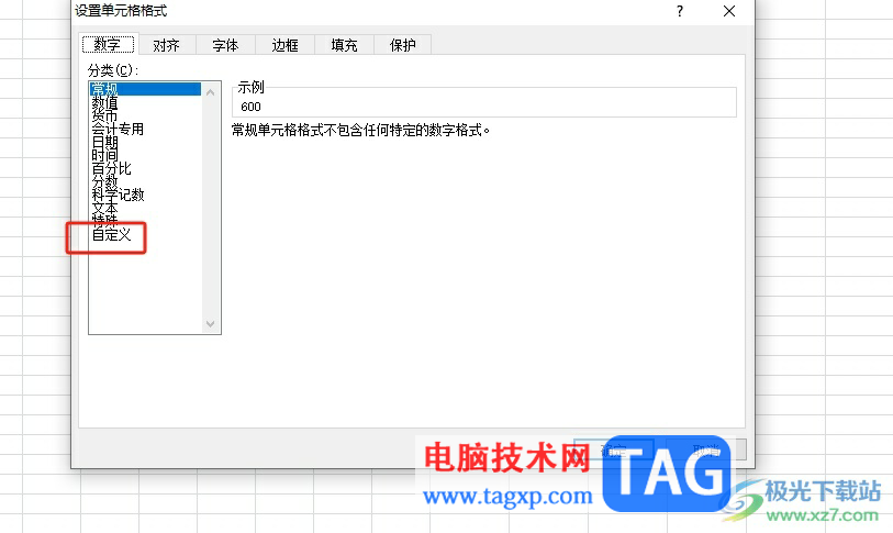3.在打开的设置单元格格式窗口中,用户在分类板块中点击自定义选项