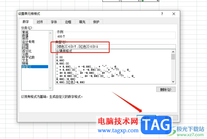 4.然后用户在右侧页面的类型方框中输入[绿色][>0]0↑;[红色][<0]0↓后,按下右下角的确定按钮