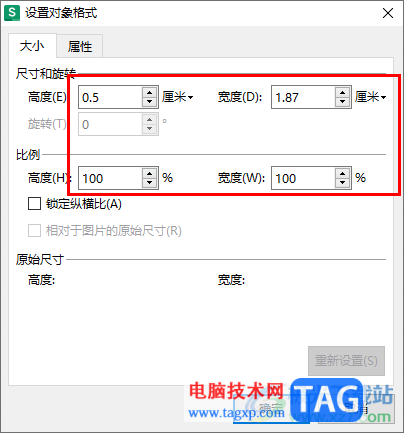 6.在打开的窗口中,你可以设置尺寸大小和旋转参数,以及还可以是盒子锁定纵横比等,在属性的窗口中也可以进行相应的设置。