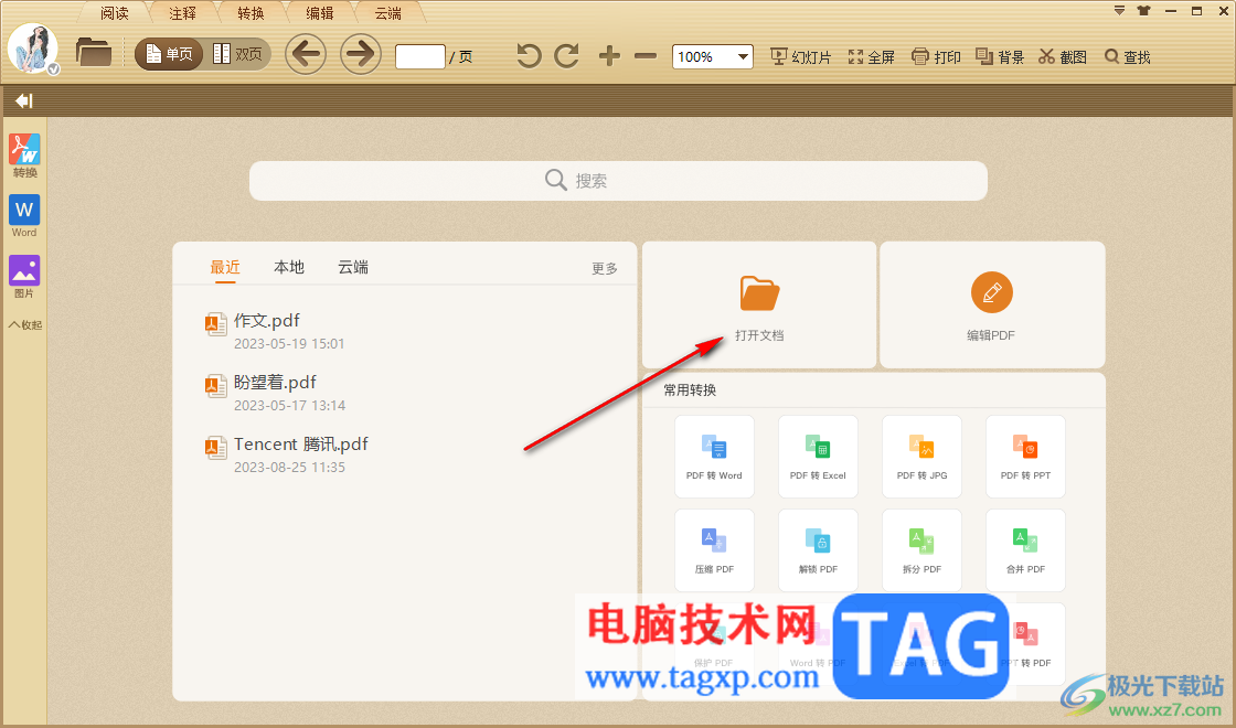 1.将电脑中的极速PDF阅读器点击打开,在页面上将【打开文档】按钮进行点击。