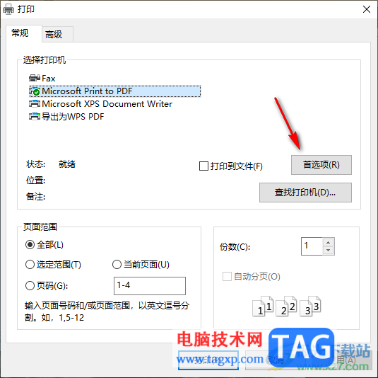 3.这时,即可在页面上显示出一个打印的设置窗口,在该窗口中将【首选项】按钮进行左键点击一下进入。