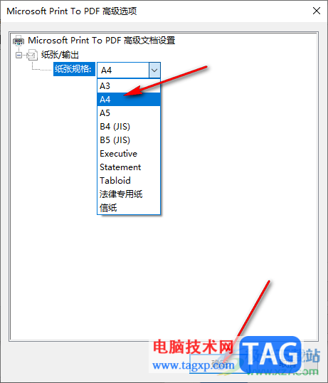 5.这时,我们将该页面中的【纸张规格】选项的下拉按钮点击打开,即可将其中的a4纸张选项进行选择就好了,之后依次点击确定按钮即可。