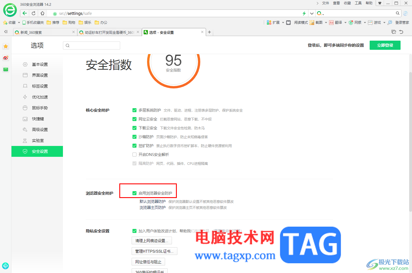 360安全浏览器成为大家十分受欢迎的一款浏览器软件,不管是在性能还是在功能上面都是极好的,其中兼容性和安全性非常的强悍,在该浏览器中还提供了一个浏览器防护的功能,当你在将360安全浏览器设置成为默认浏览器的时候,为了防止该默认浏览器被篡改的危险,那么就可以将浏览器安全防护功能启用,那么你设置该浏览器为默认浏览器之后,就不用担心默认浏览器被篡改的情况了,下方是关于如何使用360安全浏览器启用浏览器安全防护功能的具体操作方法,如果你需要的情况下可以看看方法教程,希望对大家有所帮助。