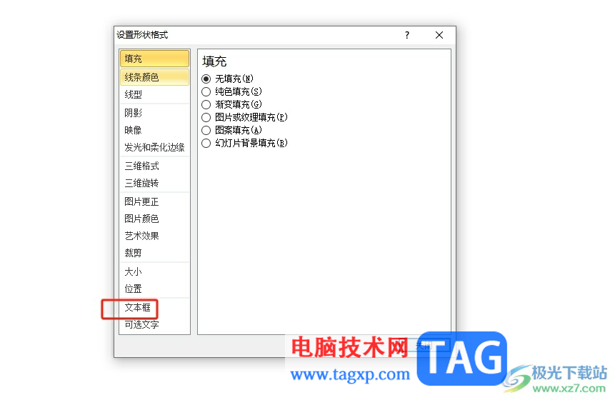 3.进入到形状格式窗口中,用户将左侧的选项卡切换到文本框选项卡上