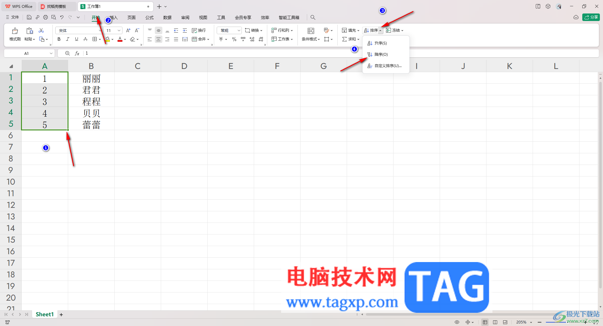 4.随后,我们将序号列选中,再点击上方的【开始】菜单,接着再点击其中的【排序】选项,选择【降序】。