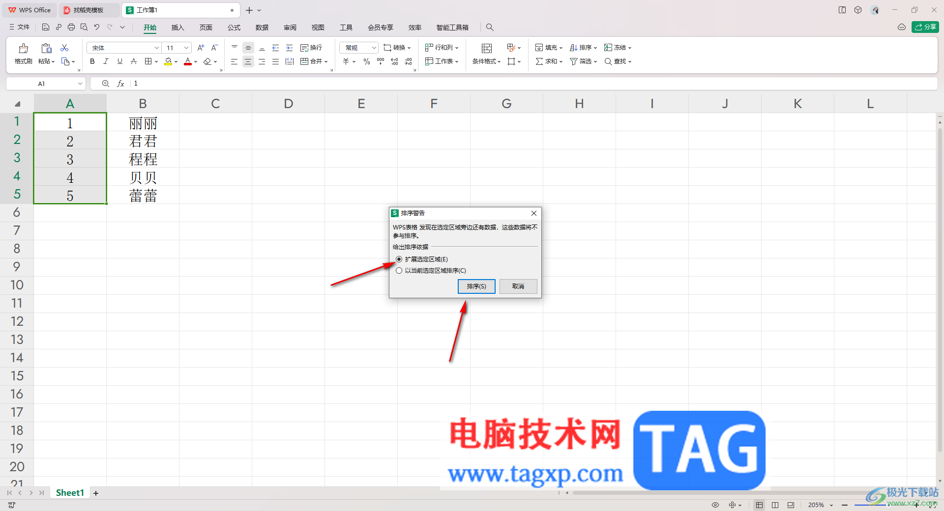 5.这时会在页面上打开一个窗口,直接选择【扩展选定区域】选项,之后点击【排序】按钮。