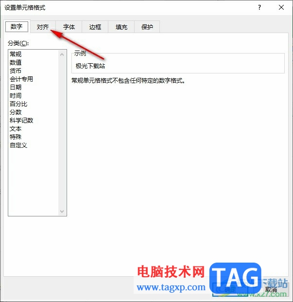 3、第三步,进入设置单元格格式页面之后,我们在该页面中点击打开“对齐”选项