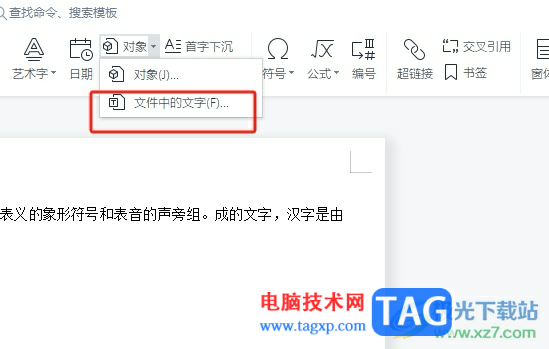3.在弹出来的下拉选项卡中,用户选择其中的文件中的文字选项