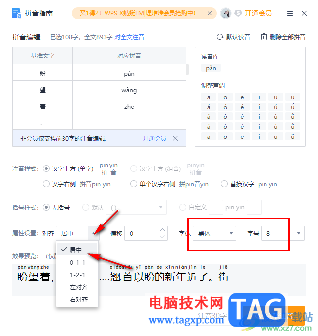 3.这时,你可以看到在打开的窗口中,有一个属性设置,你可以设置一下拼音的居中位置,以及可以设置字体或者字号的设置。