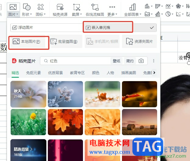3.在弹出来的下拉选项卡中,用户勾选嵌入单元格选项后按下本地图片选项