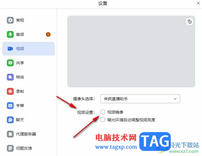 5、第五步,我们将“视频镜像”选项进行勾选,然后根据自己的需求选择是否勾选“暗光环境自动调整视频亮度”选项即可