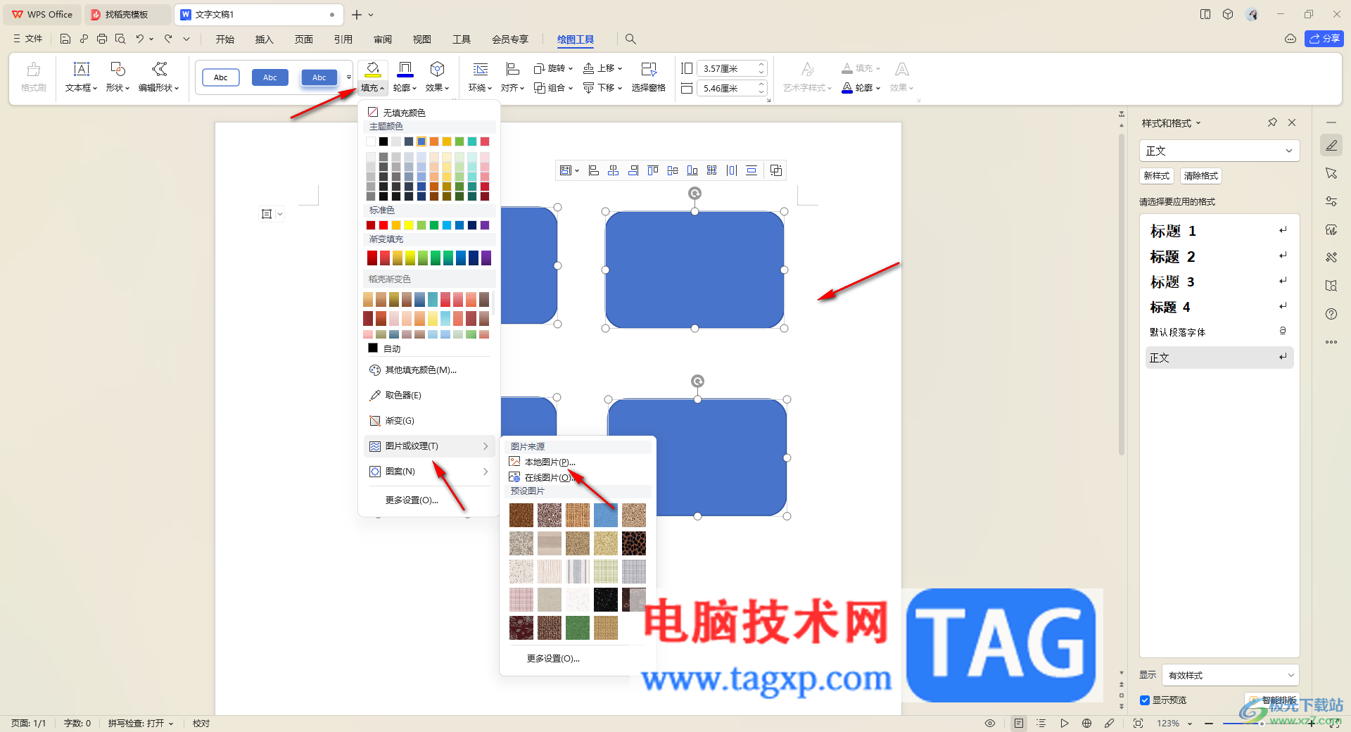 3.之后,我们需要将插入的这些形状通过Ctrl+鼠标左键全选中,然后再点击工具栏中的【填充】选项,然后点击【图片或纹理】-【本地图片】。