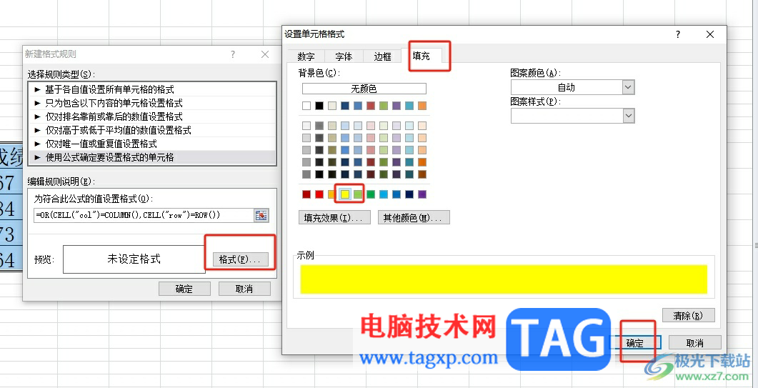 5.接着用户按下格式按钮,弹出设置单元格格式窗口,用户在填充选项卡中设置好高亮颜色后按下确定按钮