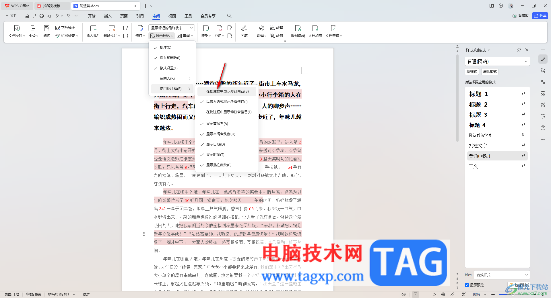 1.当我们在文档页面上对某些文字内容进行批注修改之后,不小心将批注框取消了。