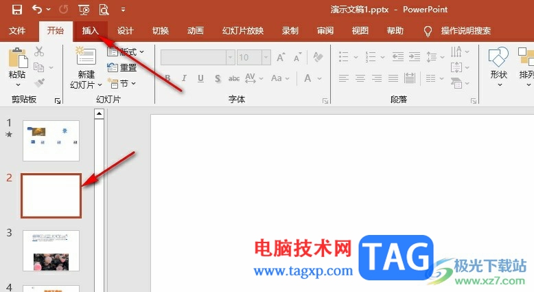 2、第二步,进入PPT页面之后,我们先点击一页幻灯片,然后在工具栏中打开插入工具