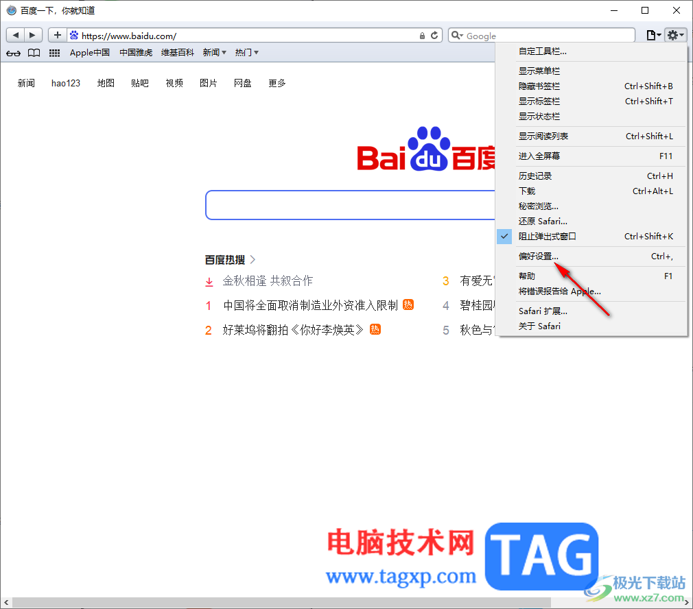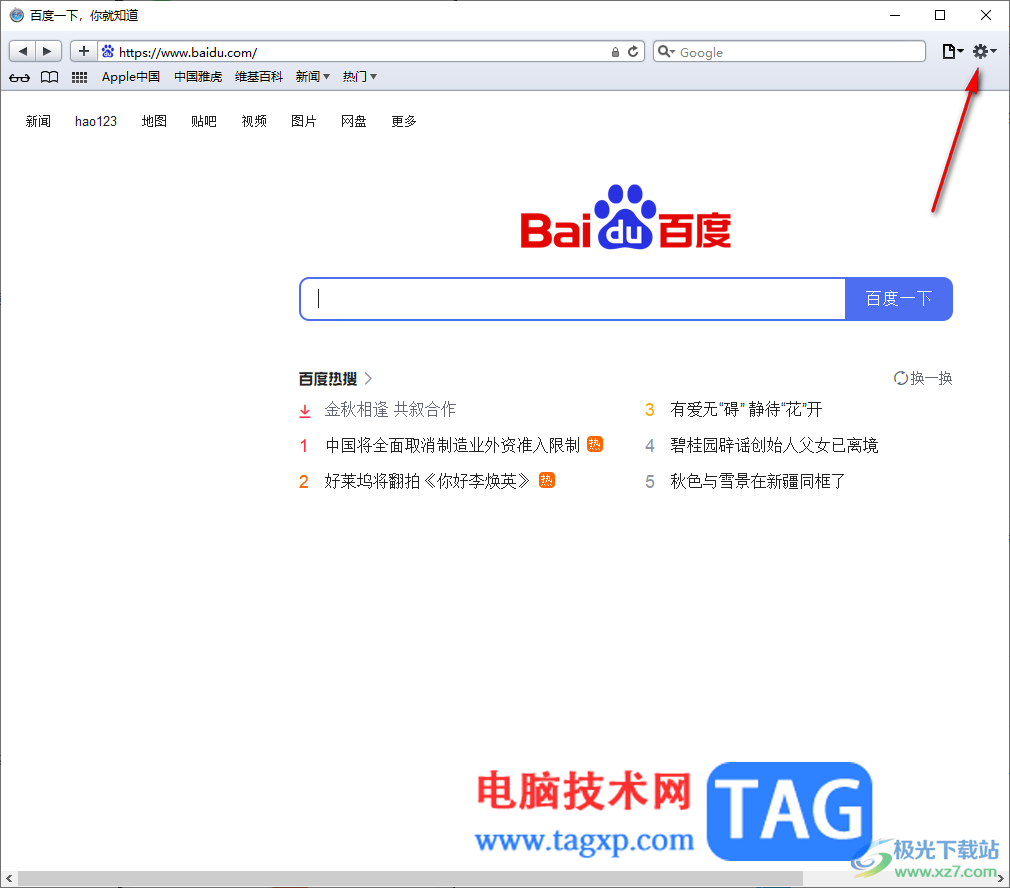 1.首先我们进入到safari浏览器中,在页面的右侧上方查看到一个齿轮状的图标,点击该图标。