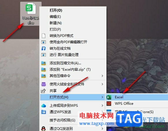 1、第一步,我们先右键单击一个表格文档,然后在菜单列表中点击打开方式选项,再在子菜单列表中选择“Excel”选项