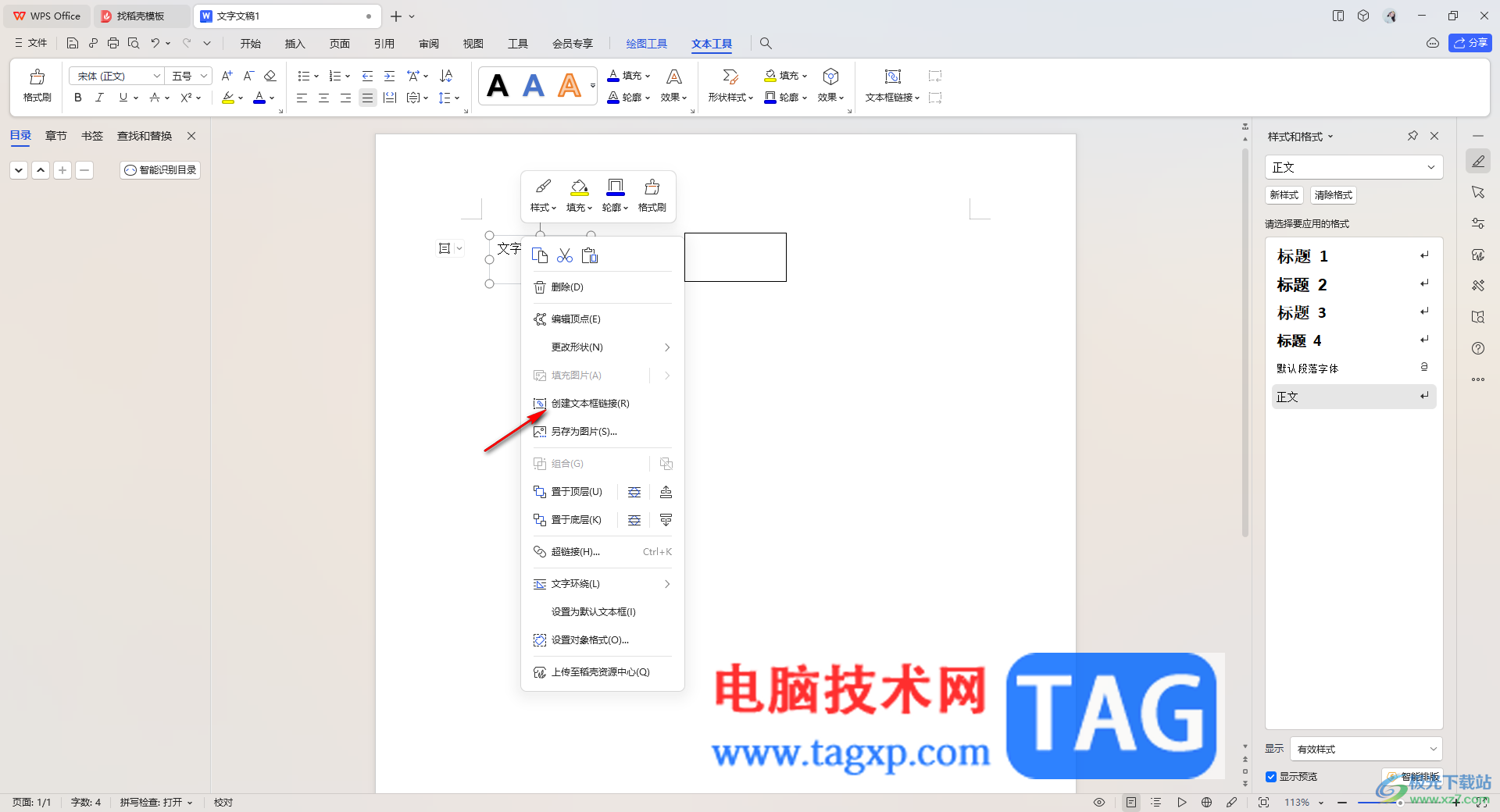 3.随后,将第一个文本框选中之后进行右键点击,在旁边出现的菜单选项中选择【创建文本框链接】选项,当鼠标光标出现了酒杯的图标之后直接定位到空白的文本框中进行点击一下即可关联。