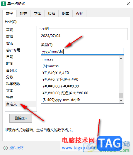 4.此外,如果你想要将日期设置成其他的格式,那么你可以单击【自定义】选项,然后自定义输入自己需要修改的日期格式,之后点击确定按钮即可。