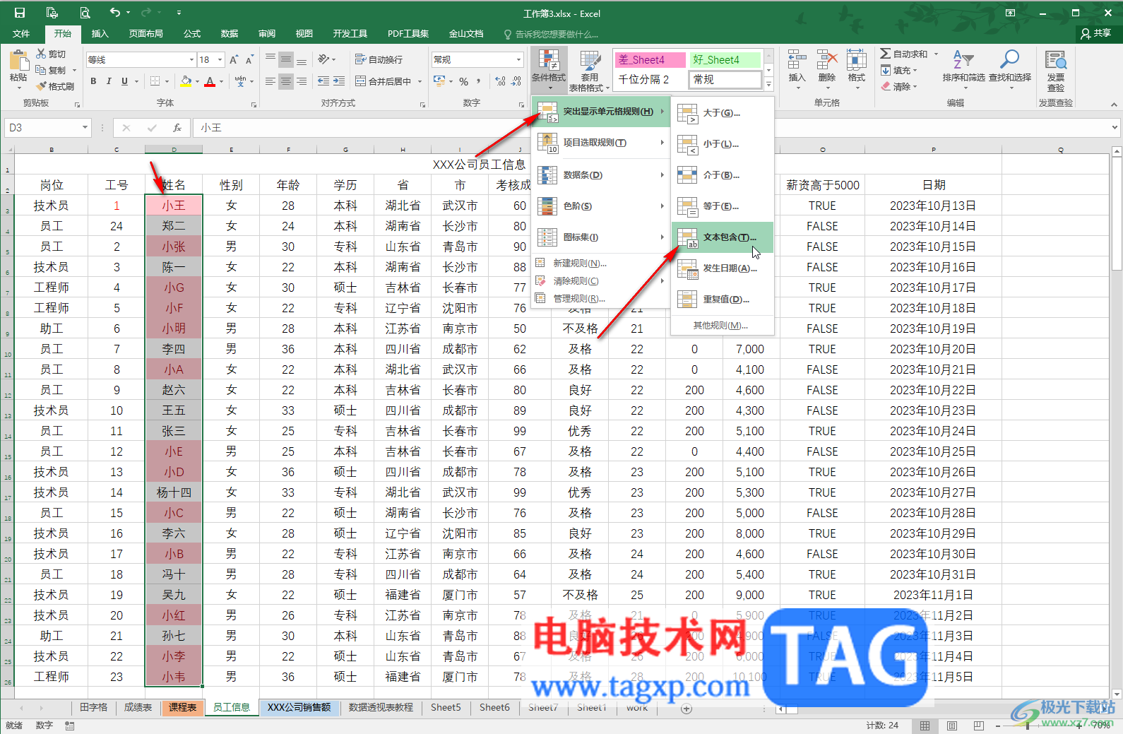 第五步:我们还可以使用“文本包含”条件设置包含某个字的内容突出显示,比如我们这里设置了突出显示姓名中带“小”字的内容。