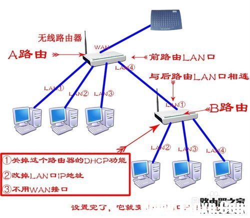 方案二:只用B路由器的LAN口,WAN口不用。路由器中的4个LAN口本来就是一个交换机。但每个路由器都带有DHCP自动分配地址的功能,为了防止冲突,必须关掉一个。另外,路由器的LAN口一般默认都是192.168.1.1,现在两个路由器的LAN口都接在一起了,要想不冲突,必须改掉。设置完成B路由器后,就可以把它当成交换机用了,它所连的电脑和A路由器所连的电脑同在一个局域网内,可以互相访问。