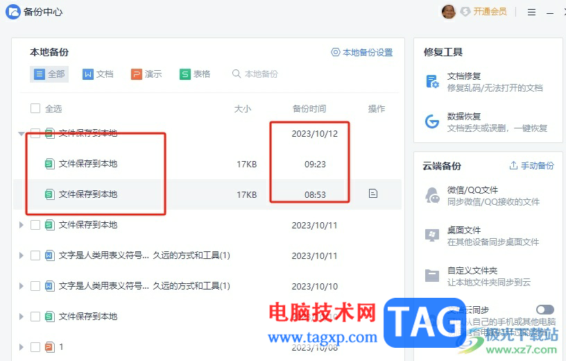 4.在打开的备份中心窗口中,用户找到自己未保存的文档版本,可以根据右侧的备份时间来选择