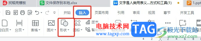 9.或者用户直接在菜单栏中点击插入选项,将会显示出相关的选项卡,用户利用其中的形状功能来解决问题,只需利用同样方法来操作即可