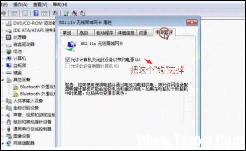 ⑤打开对话框以后,选择电源管理,然后看到“允许这台计算机关闭设备以节约电源”,在这里不打勾。然后确定,即可。
