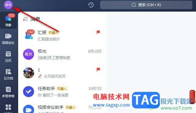 1、第一步,我们在电脑中点击打开飞书软件,然后在飞书首页点击打开自己的头像
